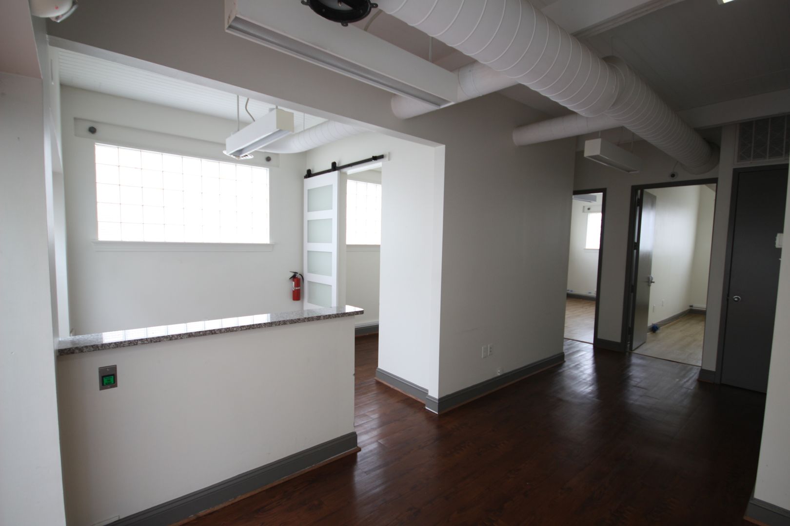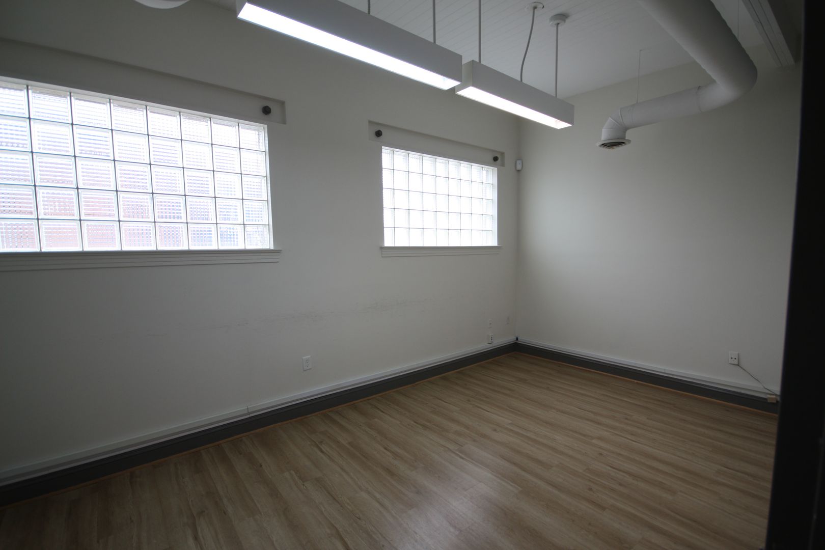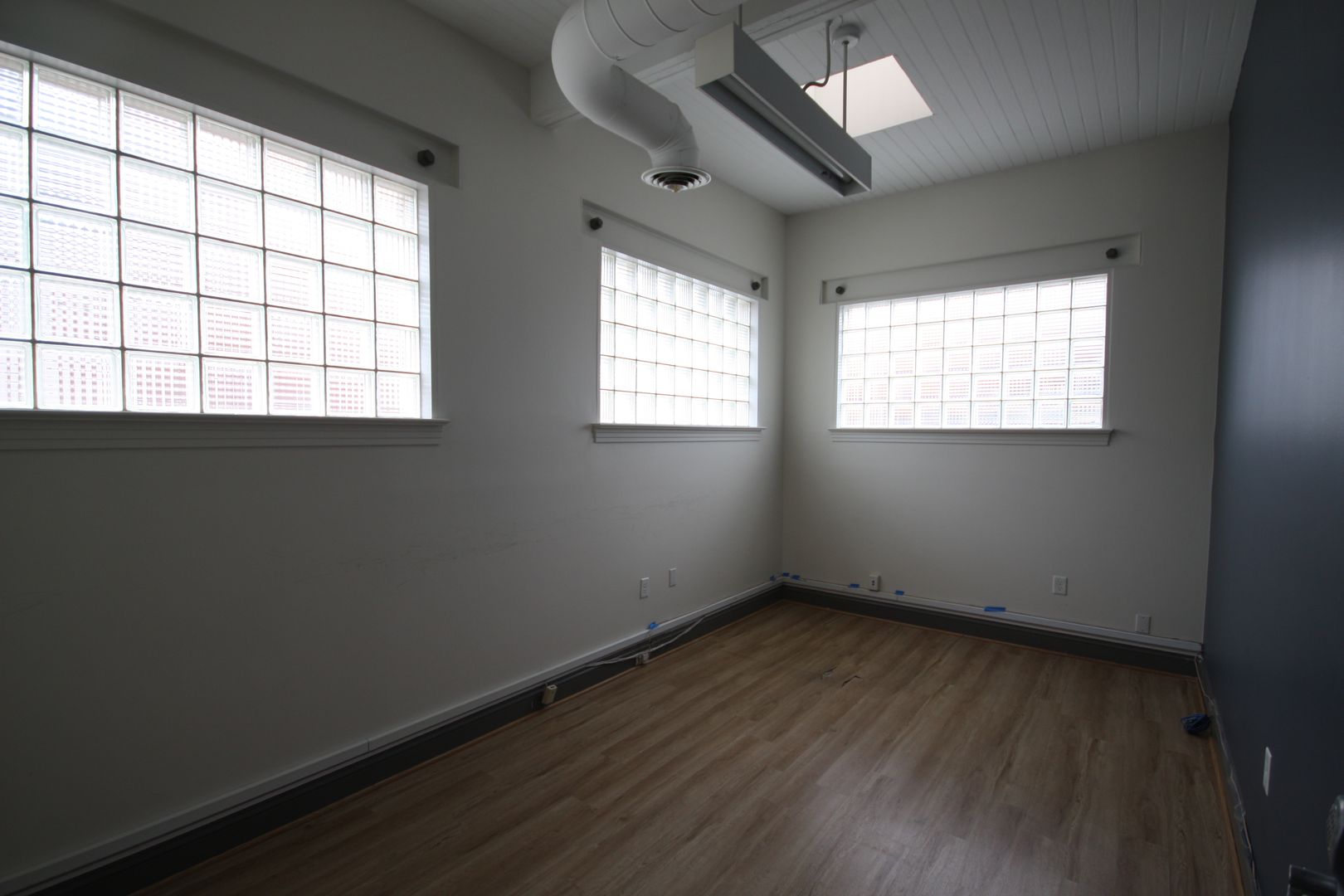 The office benefits from glass storefront entry walls and large glass block windows along two sides bathe the entire space in natural light. Please get in touch to schedule a viewing.