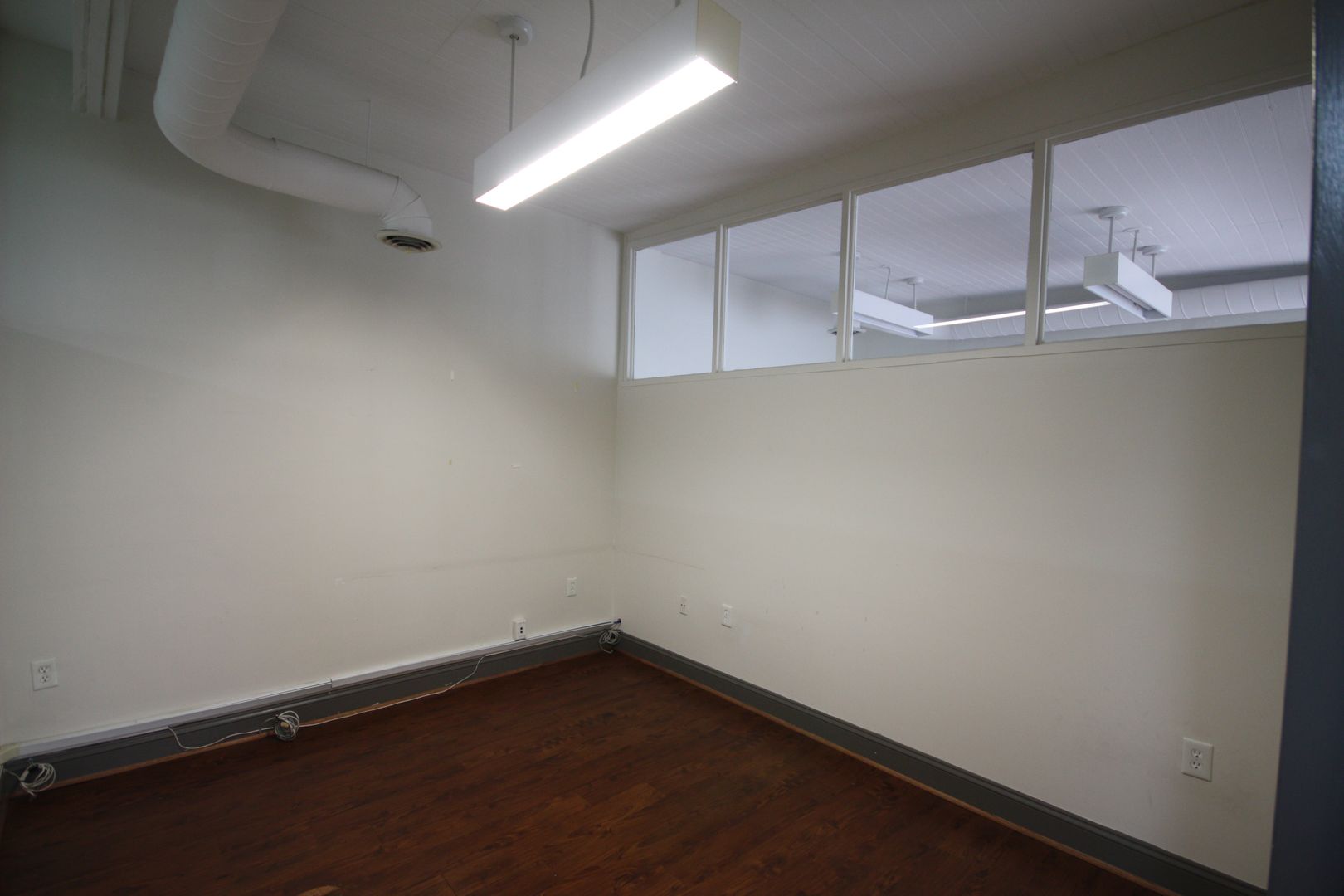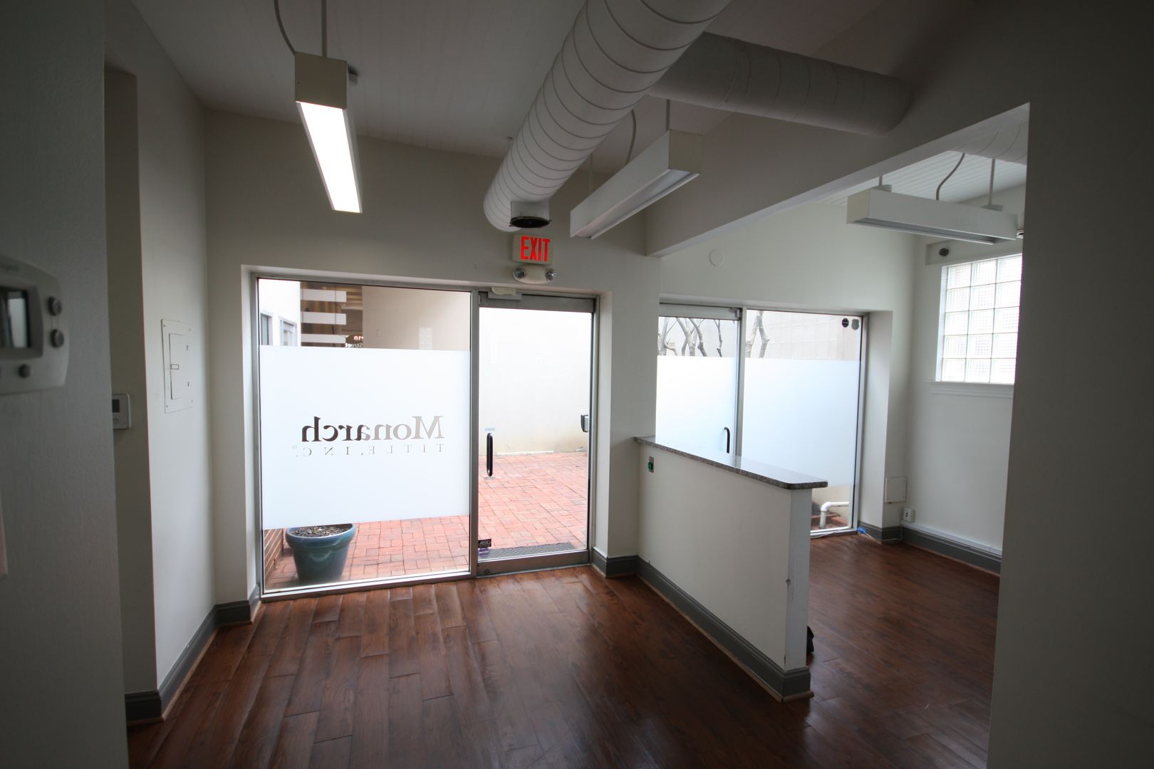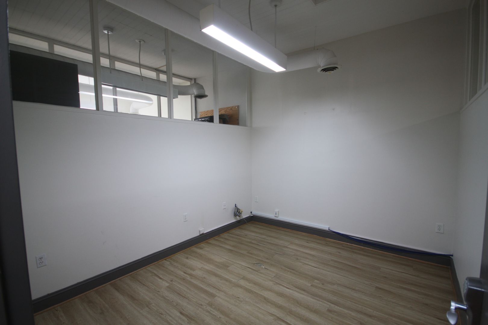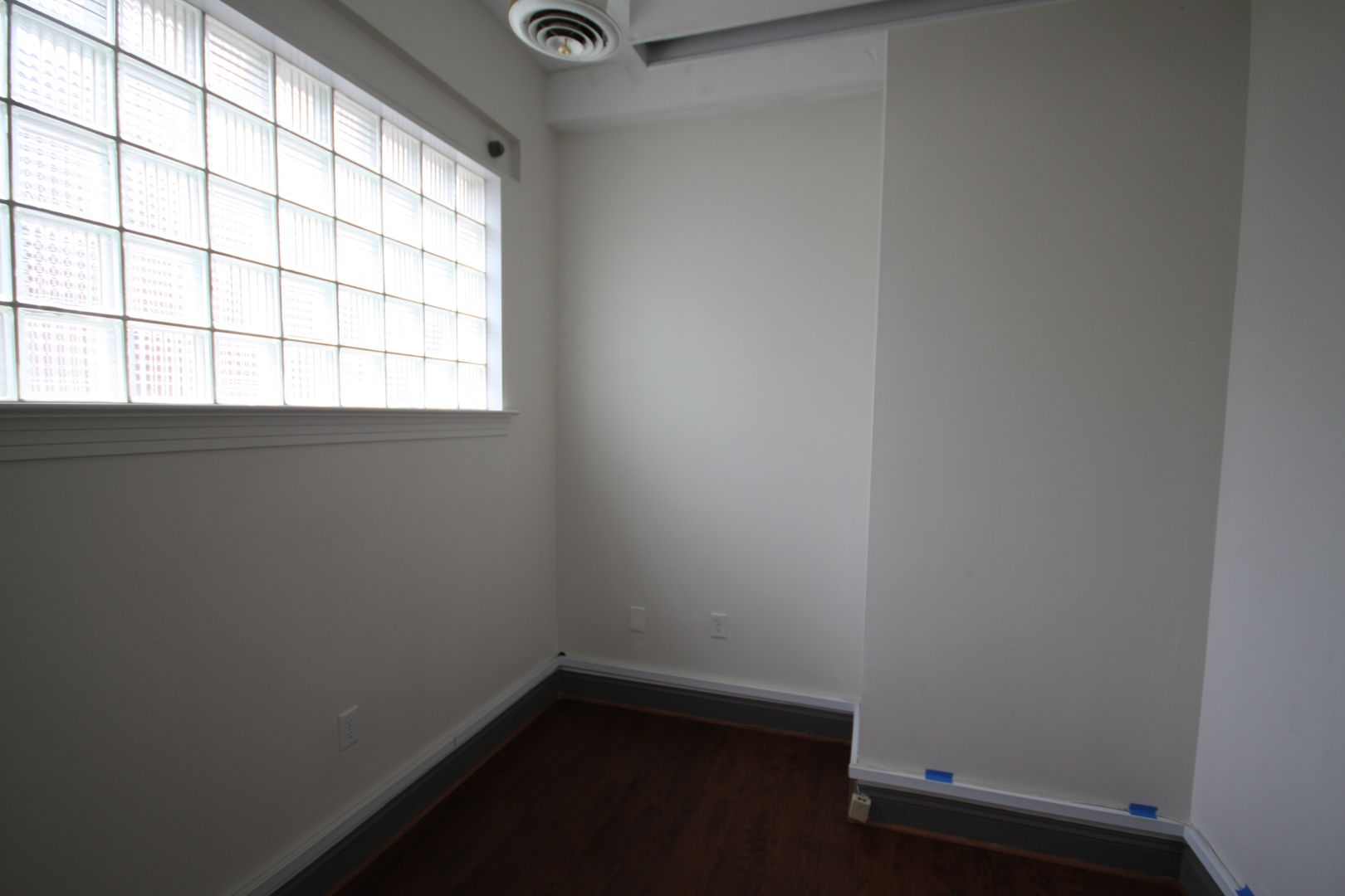 The office benefits from glass storefront entry walls and large glass block windows along two sides bathe the entire space in natural light. Please get in touch to schedule a viewing.
