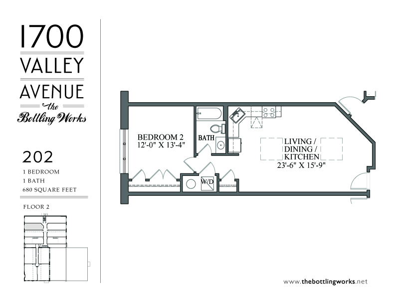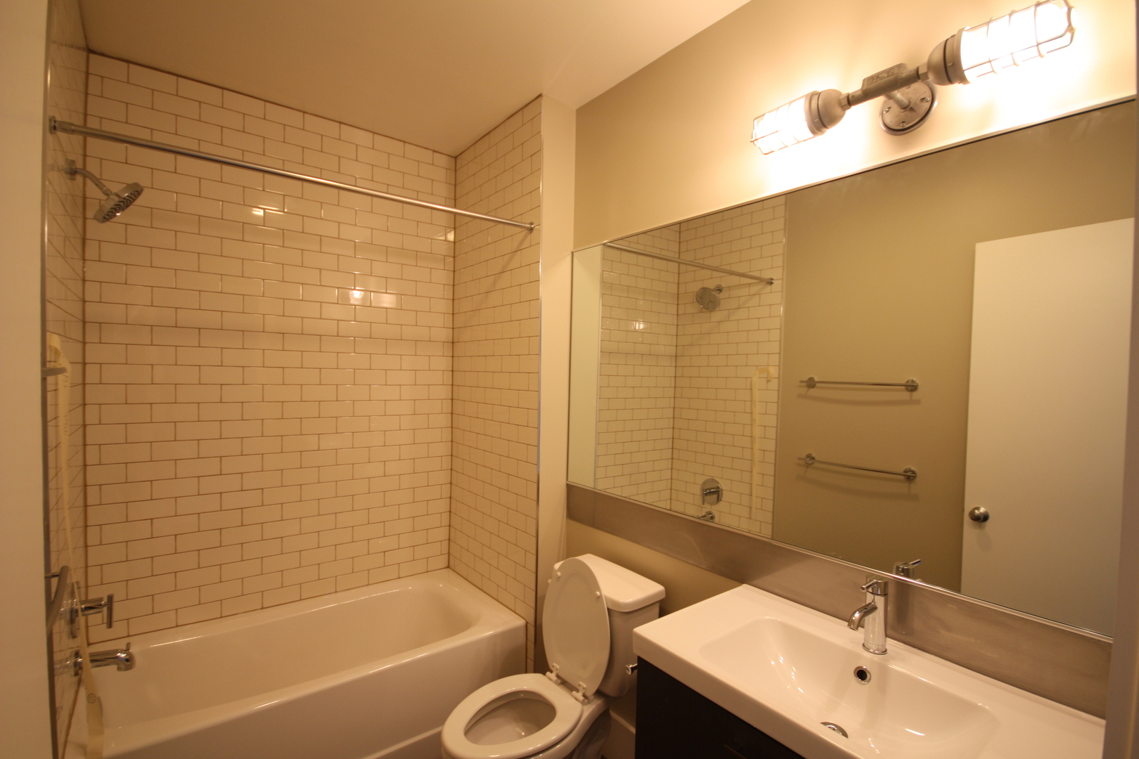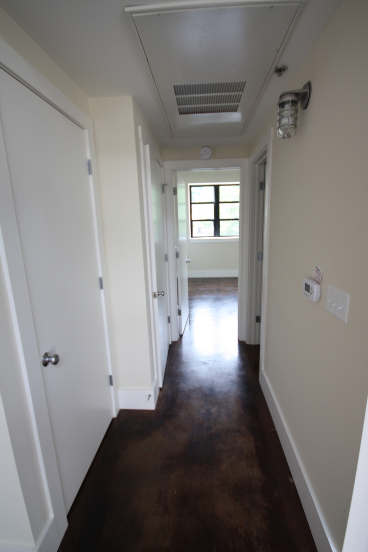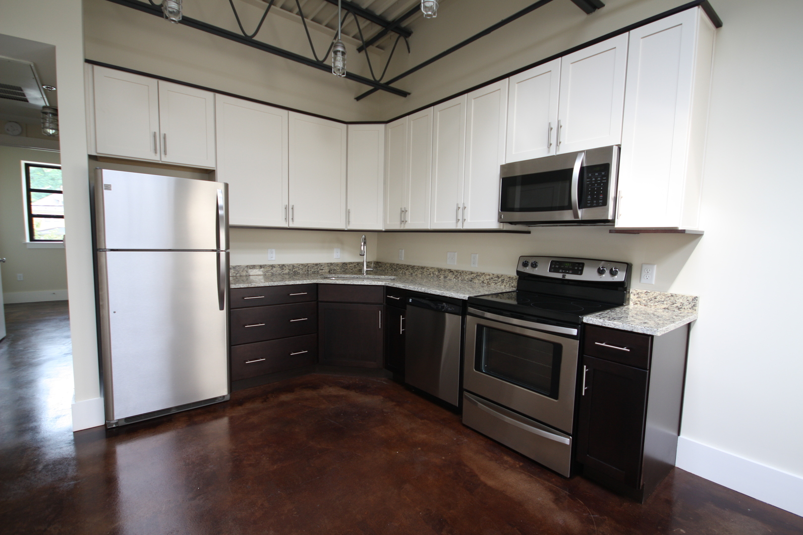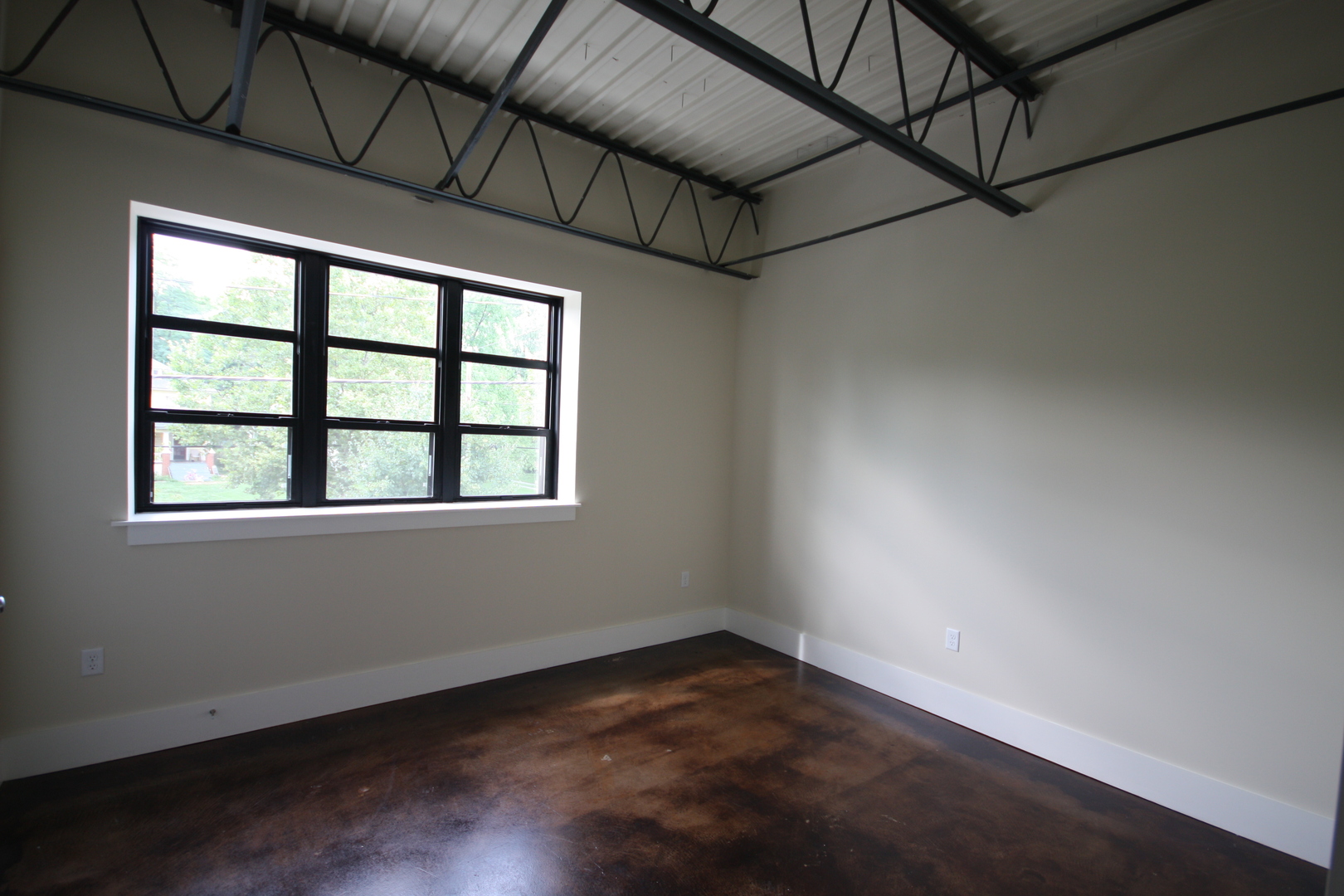 This one bed one bath apartment really shows the industrial character of the building with the stained concrete floors and exposed structure. The open plan living room and kitchen are spacious with skylights allowing tons of light to illuminate the granite counters and stainless appliances. The bedroom is quite large with a large window and closet.
